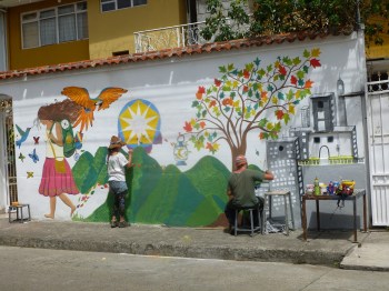 19. Nous quittons Cuenca et notre b&b, durant notre séjour des artistes auront métamorphosé ce mur blanc en une belle fresque colorée…